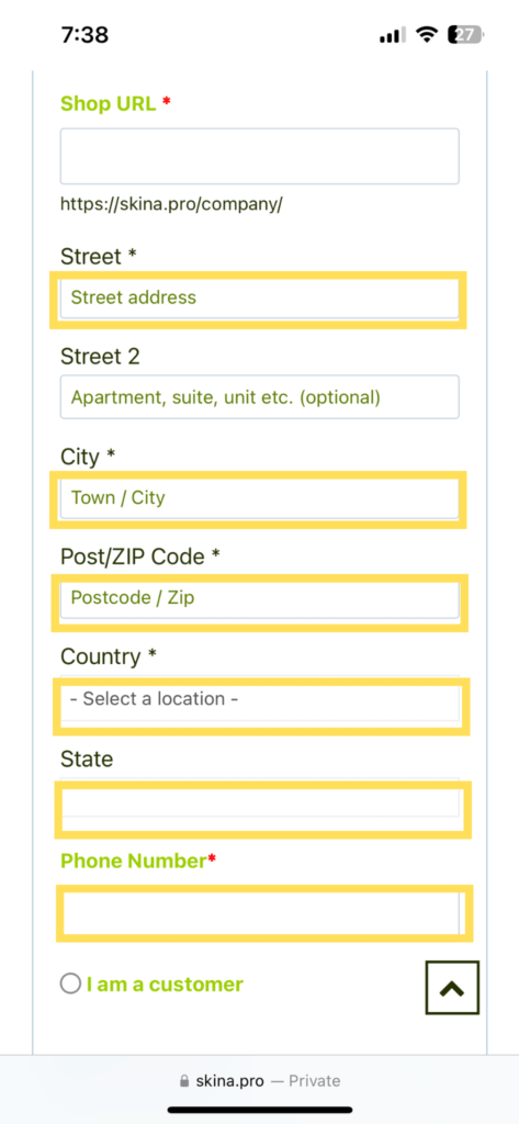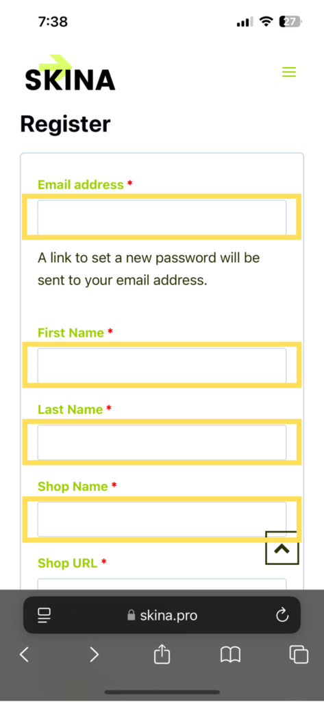 - Provide your email, first name, last name, shop name, street, city, zip code, country, state, and phone number.
